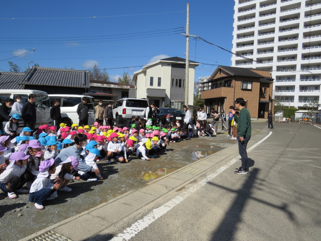 火災訓練がありました。子ども達は、口をハンカチで覆って姿勢を低く外に出て、高台まで避難しました。